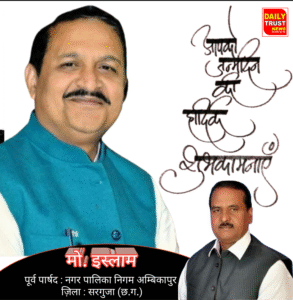 डेली ट्रस्ट न्यूज़ वेब पोर्टल के चीफ एडिटर मो. वसीम बारी व पूरी टीम की तरफ से नगर पालिका निगम अम्बिकापुर के नेता प्रतिपक्ष शफी भैया को जन्मदिवस की बहुत बहुत बधाई एवं शुभकामनाए…