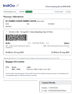 जिसका PNR/Booking Reference 084RND (Confirmed) ✈️ .6E 1461 (A320) ✈️ Date 02.08.2025, दिल्ली इंदिरा गांधी इंटरनेशनल एयरपोर्ट (टर्मिनल 3) रवानगी समय 08:40, से दुबई इंटरनेशनल एयरपोर्ट (टर्मिनल 1) पहुंचने का समय 10:50, दिनांक 2 अगस्त, 2025 !