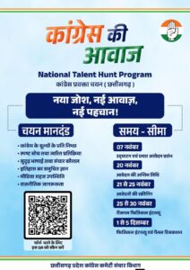 जारी प्रेस विज्ञप्ति के अनुसार अखिल भारती कांग्रेस कमेटी संचार विभाग द्वारा पूरे देश में नेशनल टैलेंट हंट कार्यक्रम का आयोजन किया जा रहा है। इसकी औपचारिक शुरुआत प्रदेश कांग्रेस कमेटी के अध्यक्ष दीपक बैज ने की है। कार्यक्रम के लिए प्रदेश स्तर, जोन (संभाग ) स्तर एवं जिला स्तर पर कार्यक्रम को चलाने के लिए समन्वयक नियुक्त किए गए है। पूरे प्रदेश को पांच जोन में बांटा गया है और जोन स्तर पर भी प्रभारी नियुक्त कर दिए गए हैं।