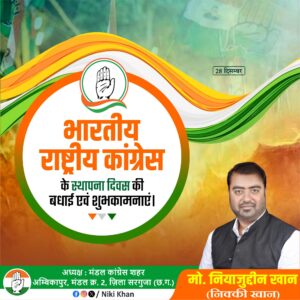 अम्बिकापुर – 28 दिसंबर, 1885 को क़ायम हुई भारतीय राष्ट्रीय कांग्रेस सिर्फ़ एक सियासी पार्टी नहीं, बल्कि हिंदुस्तान की आज़ादी, संविधान और जम्हूरियत की सबसे मज़बूत आवाज़ रही है। कांग्रेस की 140 साल की तारीख़ इस बात की गवाह है कि यह तंज़ीम सत्ता के लिए नहीं, बल्कि इंसाफ़, बराबरी और अवाम के हक़ के लिए बनी थी। कांग्रेस को इस मक़सद से क़ायम किया गया था कि ज़ुल्म के ख़िलाफ़ आवाज़ उठे, कमज़ोर को ताक़त मिले और हिंदुस्तान का हर नागरिक—चाहे वह किसी भी मज़हब, जाति या तबक़े से हो—बराबरी से जी सके। आज़ादी की जद्दोजहद से लेकर संविधान निर्माण तक, हर अहम मोड़ पर कांग्रेस ने क़ुर्बानी दी, समझौता नहीं किया।